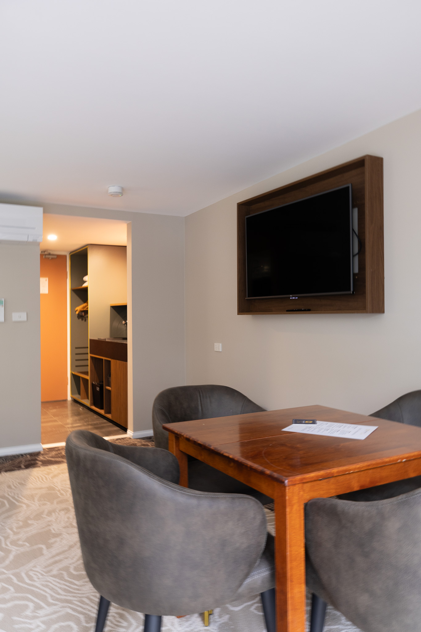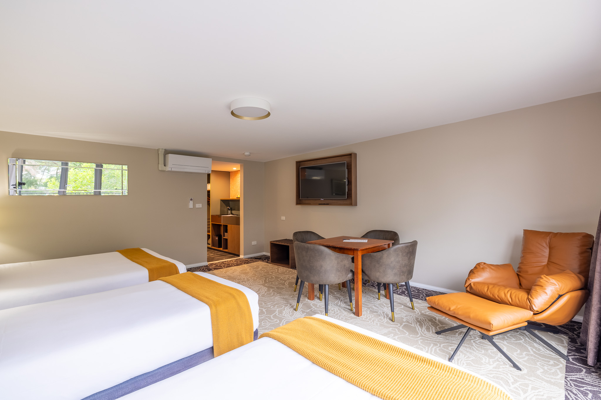 The room is air-conditioned and includes a massive Smart TV, seating area and workspace with a docking shelf for your electronic devices. The ensuite bathroom features a walk-in shower and a range of free amenities.